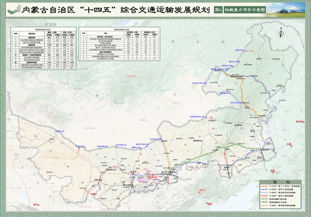根據規劃里的綜合交通網絡建設項目表,內蒙古十四五期間將推進9條高鐵重點項目,總里程4030公里,總投資4855億元。其中:續建2條,新建3條,呼包鄂一小時經濟圈2條,規劃研究2條。